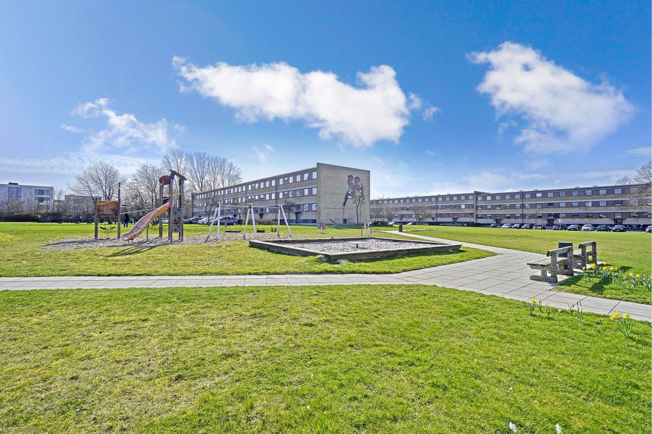 med plads til leg og boldspil, legeplads og super parkeringsforhold lige udenfor opgangen.