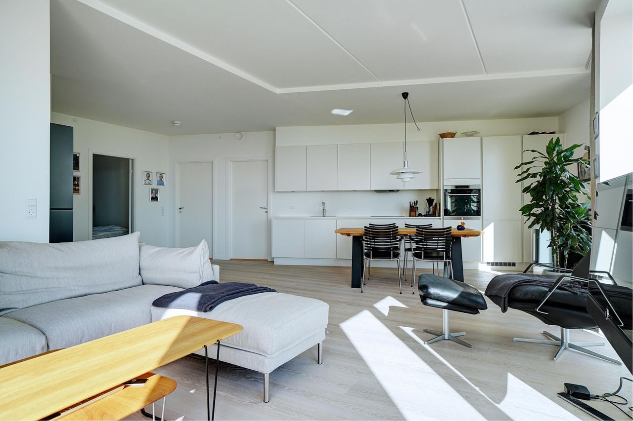 Gennem hele boligen er det stilrene, strømlinede udtryk og de mange smukke lysindfald med til